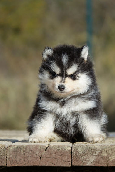 Copy est un mâle Pomsky noir et blanc, au regard doux et à la petite bouille particulièrement attendrissante 🥹. C’est typiquement le chiot qui fait craquer dès les premiers instants.