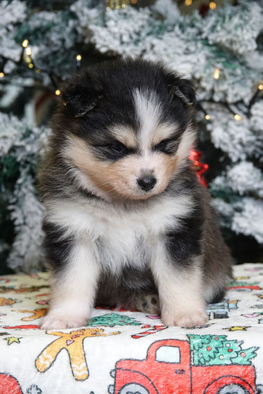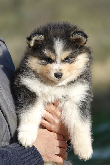 Floki est un superbe mâle Pomsky de couleur agouti, avec un marquage vraiment magnifique. Comme son frère Timi, il porte un magnifique masque accompagné d’une fleur de lys parfaitement dessinée, ce qui lui donne déjà une expression incroyable.