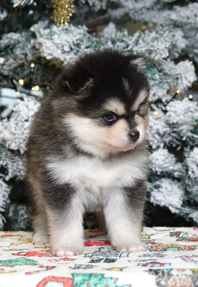 Il aura un poil fluffy, et son poids adulte est estimé autour de 6,5kg, ce qui en fera un Pomsky de gabarit toy/mini.